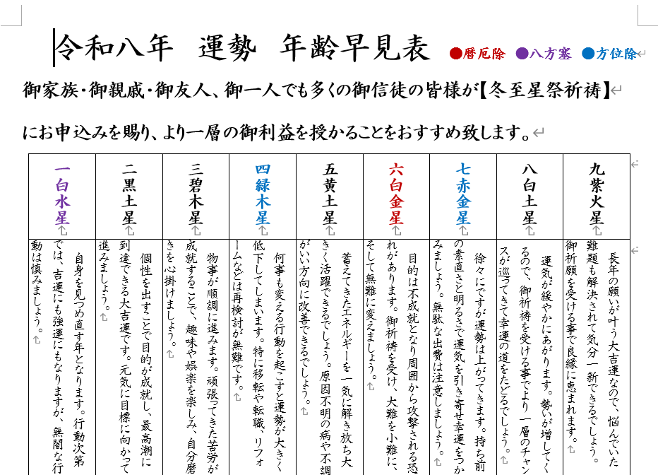 冬至にご自身それぞれの「星供祓」を致します。毎年冬至に祈願する事により、ご自身の本命星当年星を清祓い星廻りの悪い年は悪事災難から免れ、星廻りの良い年はより良く健康長寿で過ごせます様御祈祷致します。お申込みの方は別紙をご確認ください